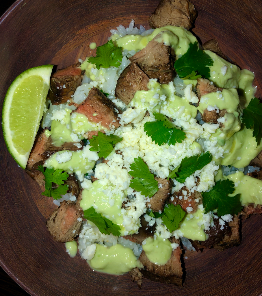 To a bowl, place your cilantro rice and steak. Drizzle your avocado crema over the steak and rice and sprinkle cotija cheese (a lactose free cheese for IBS friends) over top. Garnish your southwestern steak bowl with cilantro, a drizzle of garlic infused olive oil and extra lime juice.