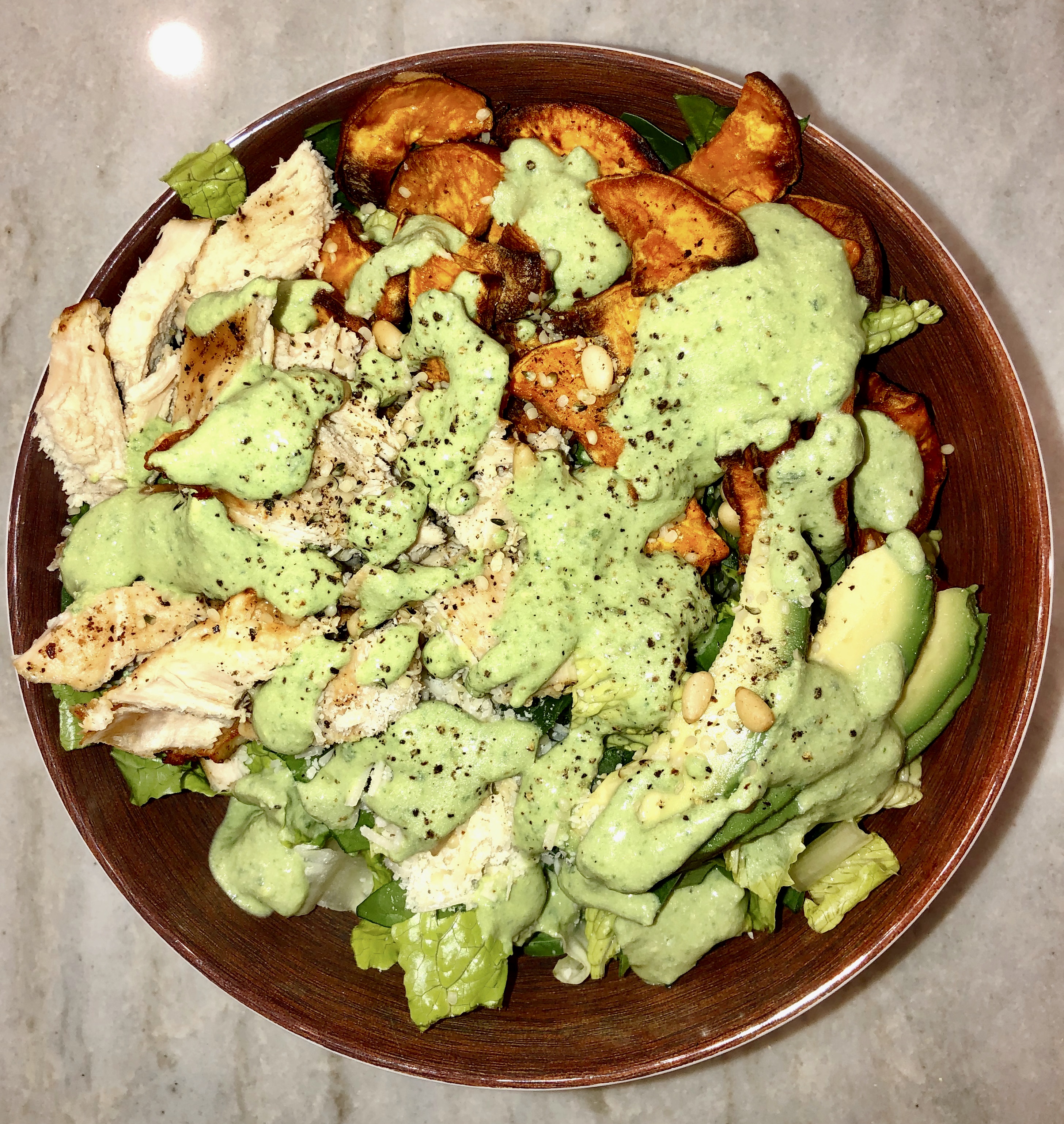 Once your chicken and sweet potato are done cooking, add them over top of your greens. Then add your avocado, a sprinkle of parmesan cheese, pine nuts, and your pesto dressing. Toss your salad and enjoy!