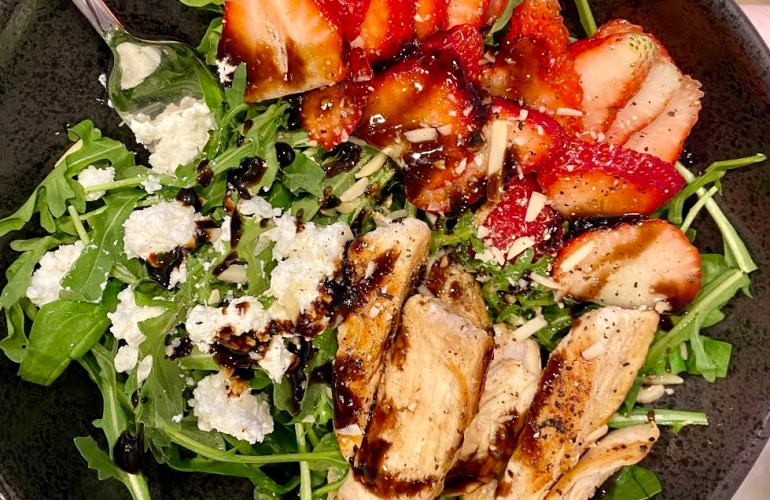 This light & refreshing salad is the perfect summertime meal. Packed with protein, fiber, and nature's candy- this salad is the whole package. Recipe makes 1 serving Ingredients: 1/2 cup chopped spinach1/2 cup arugulaa handful of chopped strawberries4 oz grilled chicken breast1 tbsp goat or feta cheesechopped or sliced almondsa drizzle of balsamic or balsamic…